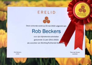 De overige bestuursleden waren unaniem van mening dat Rob het verdiende om erelid van Ruilhandel Oosterhout te zijn. Hij kreeg dan ook uit handen van de nieuwe voorzitter, Theo van Drunen, de bijbehorende oorkonde bij dat feestje uitgereikt.